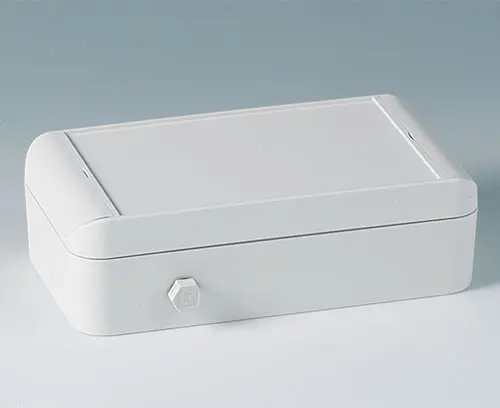 Boitier en matière plastique à deux éléments, avec joint injecté dans la partie supérieure. Zone en creux pour la protection du clavier à membrane et de membranes/feuilles design. Bossages de fixation pour barrettes DIN, circuits imprimés et plaques de montage. Dispositif rationnel de fermeture rapide en acier inox hors de la zone d‘étanchéité.