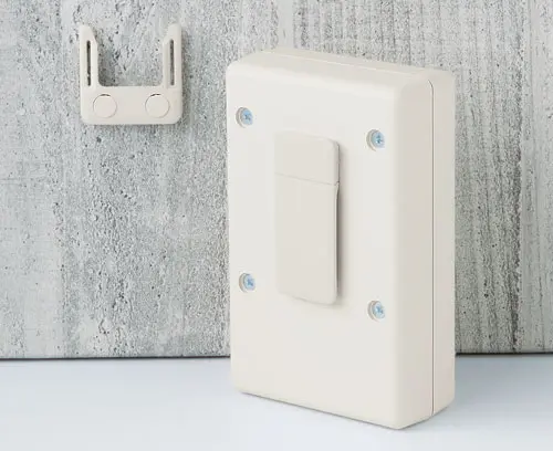Sert comme clip et/ou fixation murale. Montage orienté en largeur or en longueur (taille S seulement en longueur), pour échanger les piles, le clip se laisse enlever sans problème. Deux trous de montage diamètre 4,2 mm nécessaires.