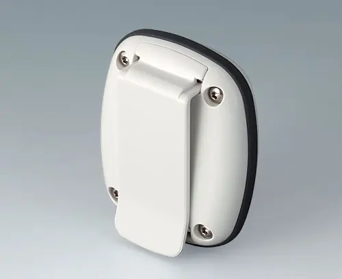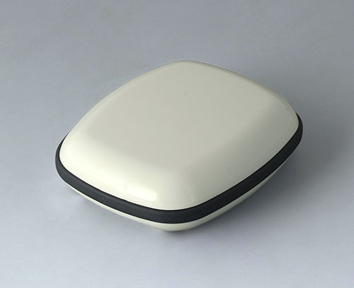 Boitier moderne pour les petits appareils du domaine des technologies portables. Conception en trois parties dont la partie supérieure et la partie inférieure en poli brillant et un joint en TPV mat.