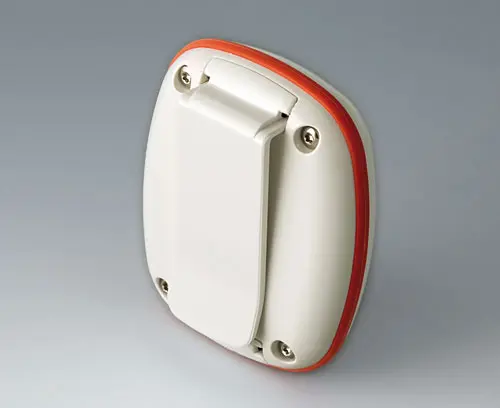 Boitier moderne pour les petits appareils du domaine des technologies portables. Conception en trois parties dont la partie supérieure et la partie inférieure en poli brillant et un joint en TPV mat.