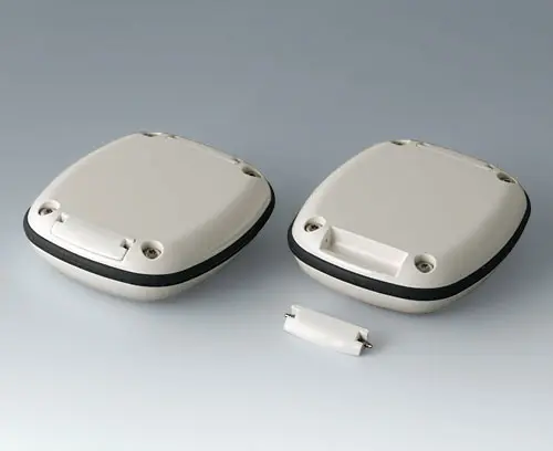 Boitier moderne pour les petits appareils du domaine des technologies portables. Conception en trois parties dont la partie supérieure et la partie inférieure en poli brillant et un joint en TPV mat. Surface en creux pour clavier à membrane ou feuille décorative.