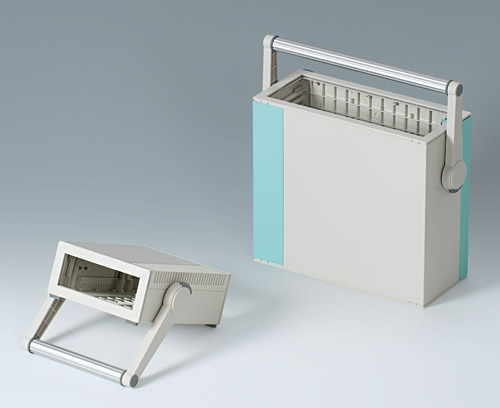 Partie latérale Poignée étrier pour porter et ajuster l'appareil. Mécanisme solide avec crans d'arrêt à 30°. Nous vous fournissons les côtés en jeu complet et le profil alu (AS050124 argent / AS051254 noir) dans la longueur requise en tant qu'accessoire séparé (sur demande). La longueur du profilé doit être 16mm plus courte que la largeur du boitier.