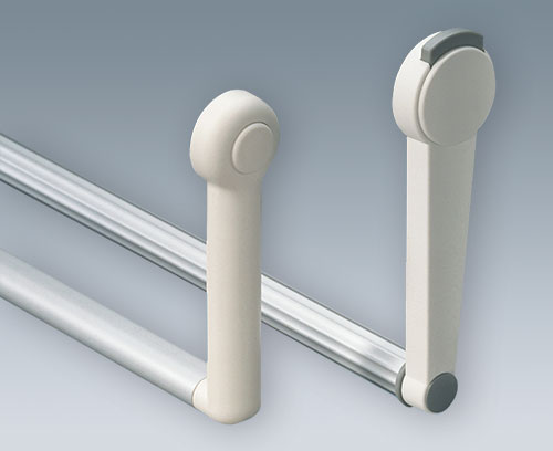 Poignée étrier en matière plastique. Profilé aluminium correspondant, anodisé, dans la largeur de votre boitier ; pièce vendue séparément.