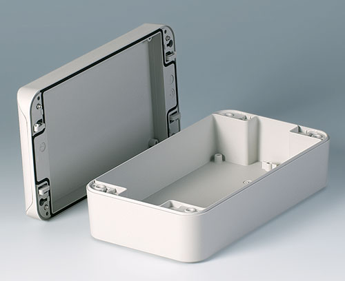 SMART-BOX 170 LARGE Boitier en quatre parties prédestiné aux applications électriques et électroniques. Le joint se trouve déjà dans la partie sup. Vissage hors la zone étanche. Partie en creux pour des claviers. Colonnettes de fixation intégrées pour cartes à circuits et barrettes DIN.