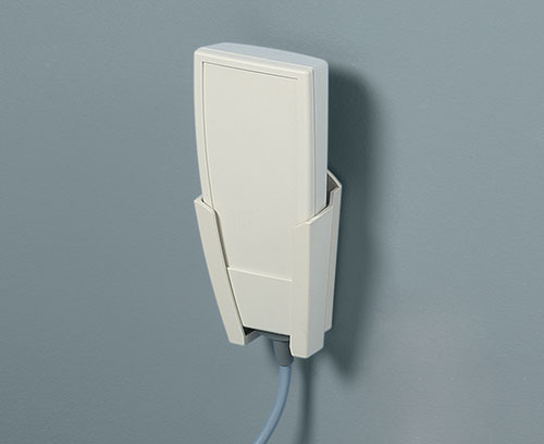 Support M Porte-outil spécial pour SMART-CASE M pour garder des télécommandes avec câbles ou sans fil. Fixation au mur ou sur autres surfaces par des vis commerciales avec diamètre de la tête de 5,3 - 8,2 mm. Le contour à l'arrière facilite aussi la réception du SMART-CASE M avec clip.