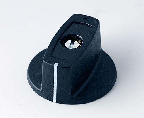 Pour potentiomètre rotatif avec axe rond selon DIN 41591. Système de noix de serrage pour un montage aisée des boutons par l'avant de l'appareil et ajustage facile à l'aide de la clé (cf. accessoires). Alésage avec chanfrein. Repère blanc. Max. couple : montage = 1,8 Nm, fonction = 1,6 Nm.