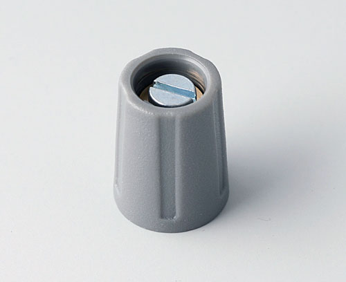 BOUTON ROND 10, sans trait Pour potentiomètre rotatif avec axe rond selon DIN 41591. Système de noix de serrage pour un montage aisée des boutons par l'avant de l'appareil et ajustage facile à l'aide de la clé (cf. accessoires). Alésage avec chanfrein.