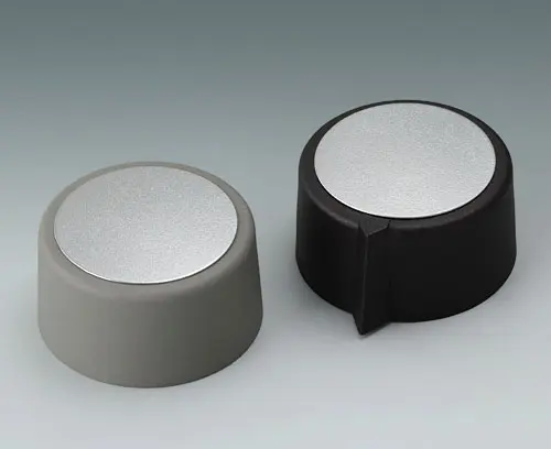 COM-KNOBS 31, avec un évidement Convenable pour des potentiomètres rotatifs avec des bouts d'arbre ronds selon DIN 41591. Système de noix de serrage pour l'assemblage des boutons convenable et frontale. Alésage sans chanfrein.