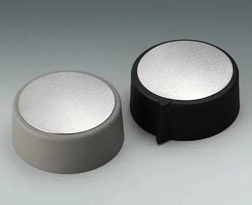 COM-KNOBS 40, avec un évidement Convenable pour des potentiomètres rotatifs avec des bouts d'arbre ronds selon DIN 41591. Système de noix de serrage pour l'assemblage des boutons convenable et frontale. Alésage sans schanfrein.