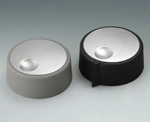 COM-KNOBS 40, avec un évidement Convenable pour des potentiomètres rotatifs avec des bouts d'arbre ronds selon DIN 41591. Système de noix de serrage pour l'assemblage des boutons convenable et frontale. Alésage sans schanfrein.