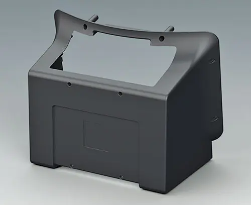 Face avant M À commander avec le corps du boitier COMMUNITEC S. Comprend une zone en retrait pour la protection des claviers à membrane et l'intégration d'écrans grand format jusqu'à 14" (35 cm), ainsi qu'une surface plane en partie basse pour les éléments de commande et les connecteurs. Des plots de fixation sont intégrés pour les PCB ou les platines de montage. Montage de la face avant par l’arrière.