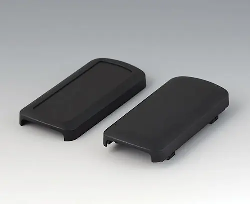 Boitier de base en deux parties, avec coquille de boitier convexe et aplanie. Zone en creux pour protéger le clavier à membrane la feuille décorative ou l’étiquette. Les deux extrémités ouvertes. Elles peuvent recevoir au choix des éléments d’extrémité ou des kits passe-câbles. (accessoires). Quatre bossages de fixation pour un circuit imprimé dans la coquille aplanie. Boitier en plastique entièrement emboîtable.
