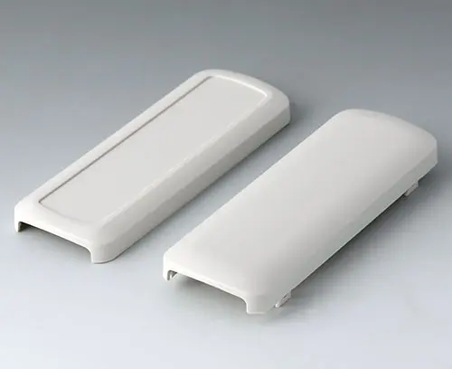 Boitier de base en deux parties, avec coquille de boitier convexe et aplanie. Zone en creux pour protéger le clavier à membrane la feuille décorative ou l’étiquette. Les deux extrémités ouvertes. Elles peuvent recevoir au choix des éléments d’extrémité ou des kits passe-câbles. (accessoires). Quatre bossages de fixation pour un circuit imprimé dans la coquille aplanie. Boitier en plastique entièrement emboîtable.