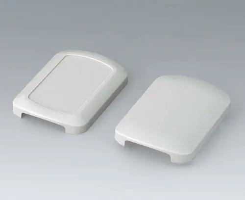 Boitier de base en deux parties, avec coquille de boitier convexe et aplanie. Zone en creux pour protéger le clavier à membrane la feuille décorative ou l’étiquette. Les deux extrémités ouvertes. Elles peuvent recevoir au choix des éléments d’extrémité ou des kits passe-câbles. (accessoires). Quatre bossages de fixation pour un circuit imprimé dans la coquille aplanie. Boitier en plastique entièrement emboîtable.