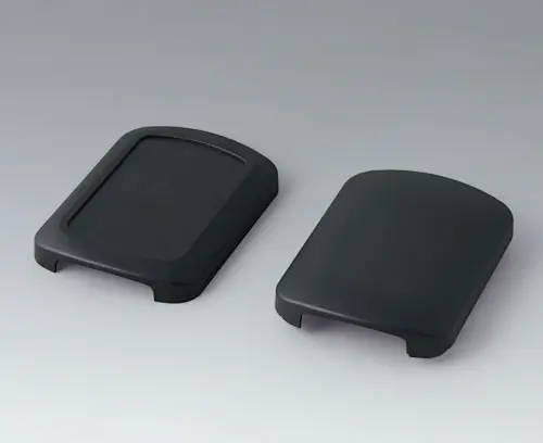 Boitier de base en deux parties, avec coquille de boitier convexe et aplanie. Zone en creux pour protéger le clavier à membrane la feuille décorative ou l’étiquette. Les deux extrémités ouvertes. Elles peuvent recevoir au choix des éléments d’extrémité ou des kits passe-câbles. (accessoires). Quatre bossages de fixation pour un circuit imprimé dans la coquille aplanie. Boitier en plastique entièrement emboîtable.