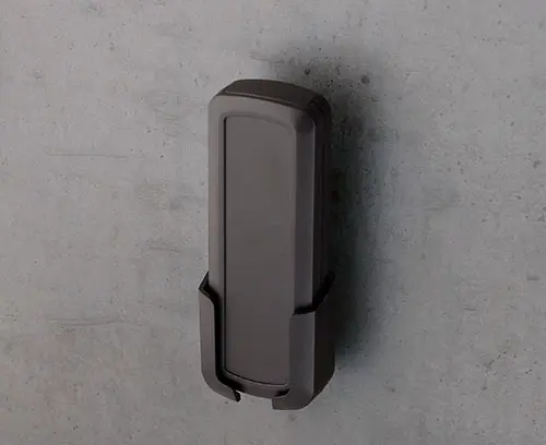 Support spécial pour le CONNECT S ; il permet le rangement en toute sécurité d’appareils mobiles fonctionnant par câble ou indépendants. Avec grand évidement pour les connecteurs enfichables. La fixation au mur ou sur des éléments de la construction s’effectue à l’aide de vis usuelles du commerce avec un diamètre de tête de 5,5 à 7 mm.