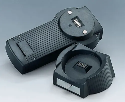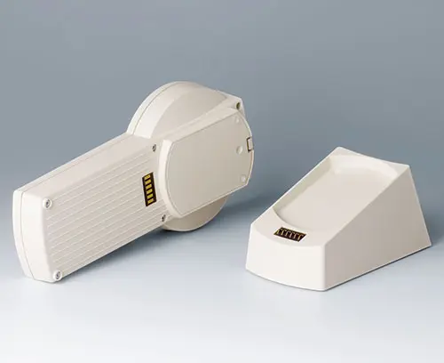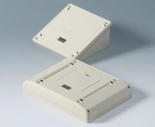 Partie inférieure S plate, version I Module : éventail inédit de domaines d'application mobile - pupitre - mural. Avec bossages de fixation pour les circuits imprimés. Élément de fermeture indispensable - au choix compartiment piles / plaque inf. avec cavité / plaque inf. avec réglettes à crans, socle (pupitre), socle (station) ou socle (pupitre/mural) - voir articles sép.