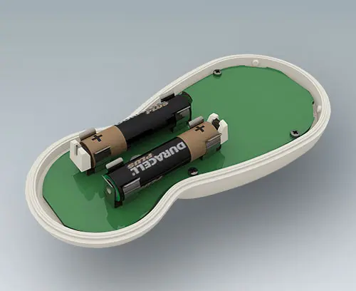BLOB UNIT Un véritable boitier manuel pouvant être tenu et manipulé d’une seule main. Conception de boitier en deux parties. Surface en creux pour les claviers à membrane. Bossages de fixation pour circuit imprimé dans la partie supérieure.