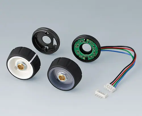 CONTROL-KNOBS 36, à éclairage optionnel Conception novatrice de bouton de commande à deux composants en matière plastique dur/doux : corpus de base du bouton translucide en dur, enrobé d’un matériau TPE doux, aspect fonctionnel à rainures.