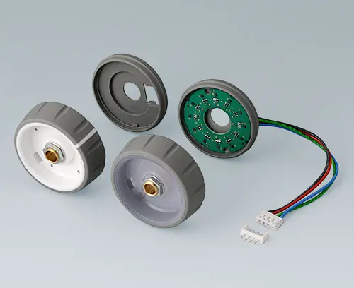 CONTROL-KNOBS 46, à éclairage optionnel Conception novatrice de bouton de commande à deux composants en matière plastique dur/doux : corpus de base du bouton translucide en dur, enrobé d’un matériau TPE doux, aspect fonctionnel à rainures.