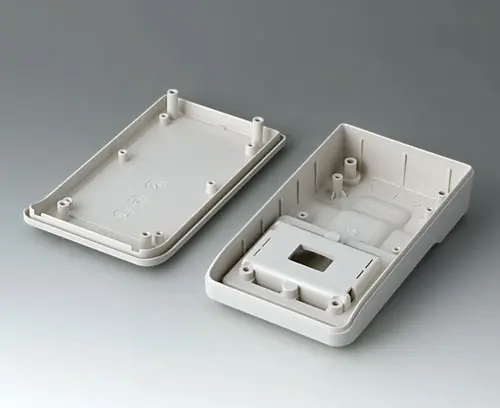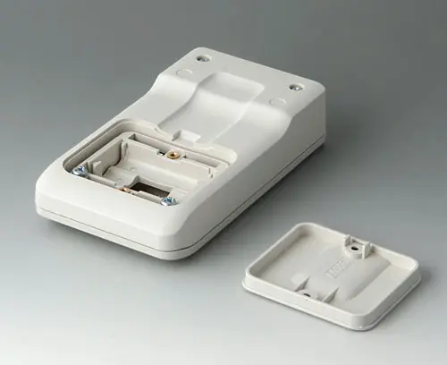 Petit boitier manuel en trois parties, de conception robuste et ergonomique. Idéal pour les applications électroniques miniaturisées. Bonne tenue en main grâce au creux pour les doigts dans la partie inférieure et un centre de gravité près du corps. Avec un compartiment pile accessible de l’extérieur pour 3 piles rondes LR03 1,5 V (AAA). Zone de commande en creux pour la protection des éléments de commande. Bossages de fixation pour les circuits imprimés et les modules dans les parties supérieure et inférieure.