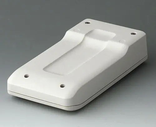 Petit boitier manuel en deux parties avec joint, de conception robuste et ergonomique. Bonne tenue en main grâce au creux pour les doigts dans la partie inférieure. Zone de commande en creux pour la protection des éléments de commande. Bossages de fixation pour les circuits imprimés et les modules dans les parties supérieure et inférieure.