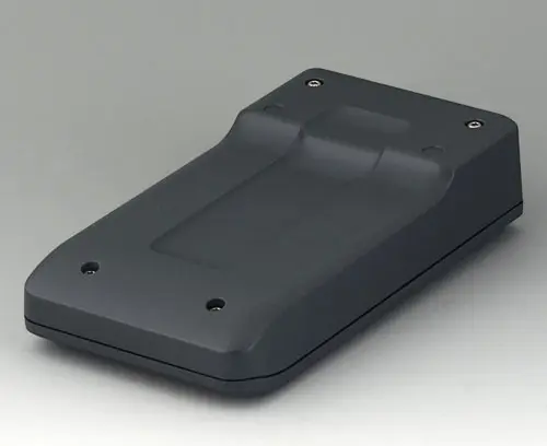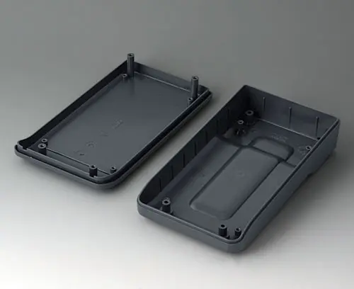 Petit boitier manuel en deux parties, de conception robuste et ergonomique. Bonne tenue en main grâce au creux pour les doigts dans la partie inférieure. Zone de commande en creux pour la protection des éléments de commande. Bossages de fixation pour les circuits imprimés et les modules dans les parties supérieure et inférieure.