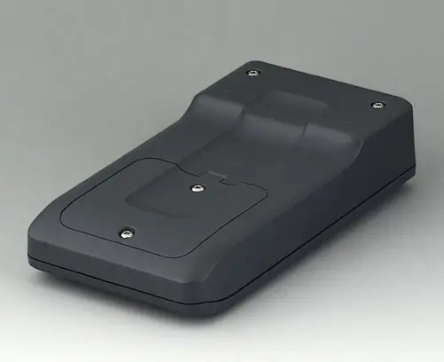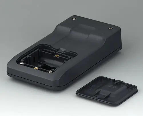 Petit boitier manuel en trois parties avec joint, de conception robuste et ergonomique. Idéal pour les applications électroniques miniaturisées. Bonne tenue en main grâce au creux pour les doigts dans la partie inférieure et un centre de gravité près du corps. Avec un compartiment pile accessible de l’extérieur pour 3 piles rondes NR6 1,5 V (AA). Zone de commande en creux pour la protection des éléments de commande. Bossages de fixation pour les circuits imprimés et les modules dans les parties supérieure et inférieure.
