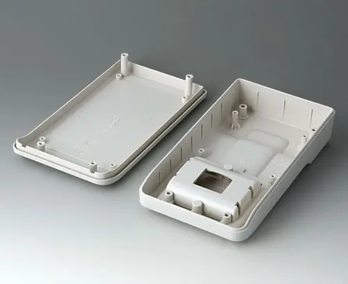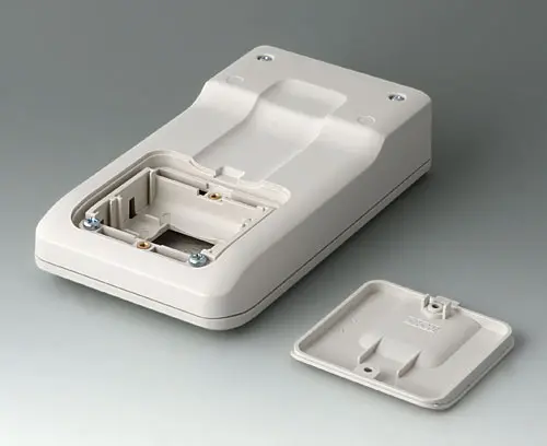 Petit boitier manuel en trois parties, de conception robuste et ergonomique. Idéal pour les applications électroniques miniaturisées. Bonne tenue en main grâce au creux pour les doigts dans la partie inférieure et un centre de gravité près du corps. Avec un compartiment pile accessible de l’extérieur pour 3 piles rondes NR6 1,5 V (AA). Zone de commande en creux pour la protection des éléments de commande. Bossages de fixation pour les circuits imprimés et les modules dans les parties supérieure et inférieure.