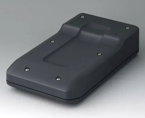 Boitier manuel en deux parties avec joint, de conception robuste et ergonomique. Bonne tenue en main grâce au creux pour les doigts dans la partie inférieure. Zone de commande en creux pour la protection des éléments de commande. Bossages de fixation pour les circuits imprimés et les modules dans les parties supérieure et inférieure.
