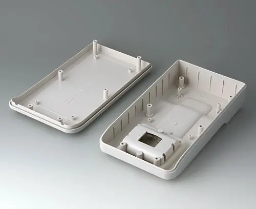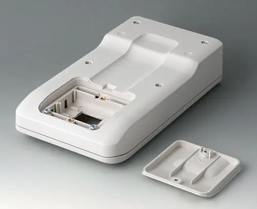 Boitier manuel en trois parties, de conception robuste et ergonomique. Idéal pour les applications électroniques miniaturisées. Bonne tenue en main grâce au creux pour les doigts dans la partie inférieure et un centre de gravité près du corps. Avec un compartiment pile accessible de l’extérieur pour 3 piles rondes NR6 1,5 V (AA). Zone de commande en creux pour la protection des éléments de commande. Bossages de fixation pour les circuits imprimés et les modules dans les parties supérieure et inférieure.