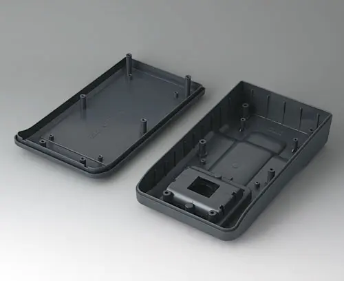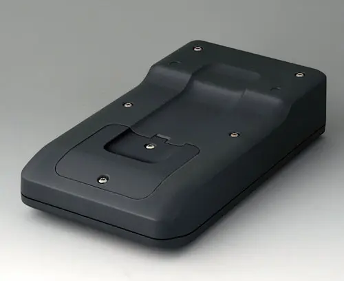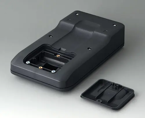 Boitier manuel en trois parties, de conception robuste et ergonomique. Idéal pour les applications électroniques miniaturisées. Bonne tenue en main grâce au creux pour les doigts dans la partie inférieure et un centre de gravité près du corps. Avec un compartiment pile accessible de l’extérieur pour 3 piles rondes NR6 1,5 V (AA). Zone de commande en creux pour la protection des éléments de commande. Bossages de fixation pour les circuits imprimés et les modules dans les parties supérieure et inférieure.