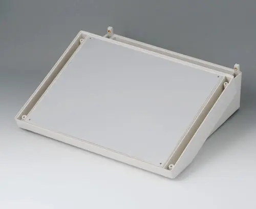DATEC-TERMINAL L, Vers. II Boitier de base avec emplacement de bornes. La surface portant les éléments de commande à inclinaison ergonomique peut recevoir au choix une plaque profil, un couvercle ou une plaque frontale. Il convient au montage de cartes en format Europe.