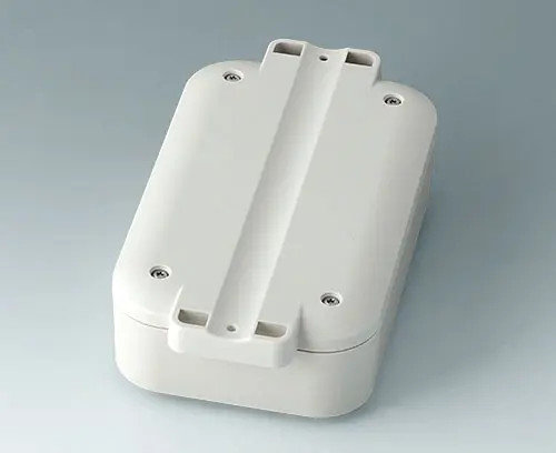 Boitier en matière plastique en deux parties avec partie supérieure plane. Partie inférieure avec pattes intégrées permettant une installation rapide au mur ou avec la fixation sur des tubes / profilés ronds. Construction robuste avec un assemblage par rainure / languette qui a fait ses preuves. Vissage avec des vis inox et entraînement Torx. Bossages de fixation pour circuits imprimés et composants dans les parties supérieure et inférieure.