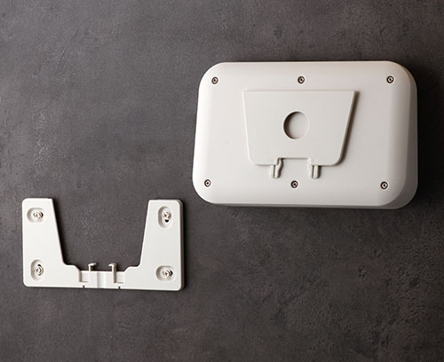 L’adaptateur (106 x 75 mm) se fixe sur la partie inférieure du boitier au moyen de 4 vis. Quatre trous de montage diamètre 3,5 mm nécessaires. L’adaptateur permet d’encliqueter le boitier rapidement et en toute simplicité au support fixé au mur. Une variante est de visser les parties avec deux vis, ce qui empêche en outre tout retrait non autorisé.