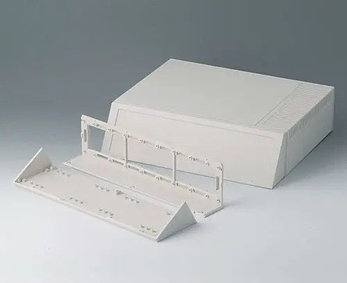 Partie frontale de commande inclinée et ergonomique. Construction en 2 parties pour l'acccessibilité facile des composants. Partie en creux pour des claviers à membrane souple. Angle de lecture au mur : 60°, sur la table : 30°.