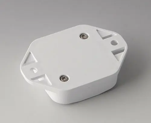 Boitier en plastique en 2 parties avec partie supérieure plate. Partie inférieure avec bride intégrée pour un montage mural rapide ou pour la fixation sur des rails et des profilés tubulaires ou sur un mât. Construction robuste avec assemblage à rainure et languette éprouvé. Vissage avec vis en acier inoxydable et entraînement Torx. Socle de fixation pour les circuits imprimés et les composants dans la partie supérieure et inférieure. La fixation sur les socles s'effectue par sertissage à chaud.