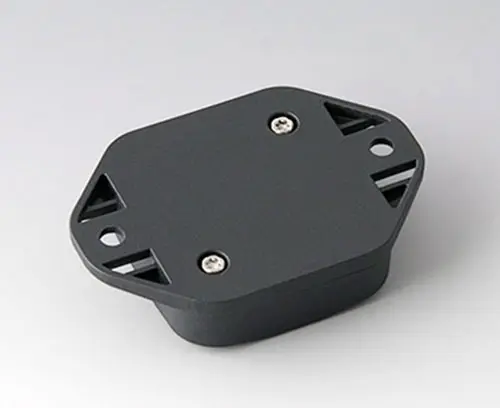 Boitier en plastique en 2 parties avec partie supérieure plate. Partie inférieure avec bride intégrée pour un montage mural rapide ou pour la fixation sur des rails et des profilés tubulaires ou sur un mât. Construction robuste avec assemblage à rainure et languette éprouvé. Vissage avec vis en acier inoxydable et entraînement Torx. Socle de fixation pour les circuits imprimés et les composants dans la partie supérieure et inférieure. La fixation sur les socles s'effectue par sertissage à chaud.