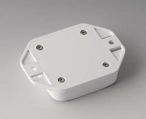 Boitier en plastique en 2 parties avec partie supérieure plate. Partie inférieure avec bride intégrée pour un montage mural rapide ou pour la fixation sur des rails et des profilés tubulaires ou sur un mât. Construction robuste avec assemblage à rainure et languette éprouvé. Vissage avec vis en acier inoxydable et entraînement Torx. Socle de fixation pour les circuits imprimés et les composants dans la partie supérieure et inférieure. La fixation sur les socles s'effectue par sertissage à chaud.