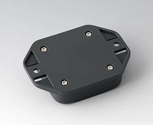 Boitier en plastique en 2 parties avec partie supérieure plate. Partie inférieure avec bride intégrée pour un montage mural rapide ou pour la fixation sur des rails et des profilés tubulaires ou sur un mât. Construction robuste avec assemblage à rainure et languette éprouvé. Vissage avec vis en acier inoxydable et entraînement Torx. Socle de fixation pour les circuits imprimés et les composants dans la partie supérieure et inférieure. La fixation sur les socles s'effectue par sertissage à chaud.