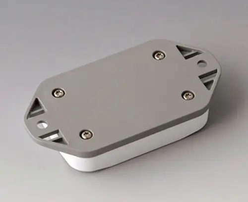 Boitier en plastique en 2 parties avec partie supérieure plate. Partie inférieure avec bride intégrée pour un montage mural rapide ou pour la fixation sur des rails et des profilés tubulaires ou sur un mât. Construction robuste avec assemblage à rainure et languette éprouvé. Vissage avec vis en acier inoxydable et entraînement Torx. Socle de fixation pour les circuits imprimés et les composants dans la partie supérieure et inférieure. La fixation sur les socles s'effectue par sertissage à chaud.