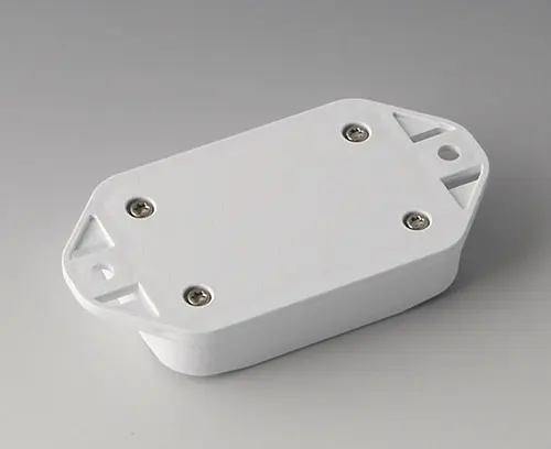 Boitier en plastique en 2 parties avec partie supérieure plate. Partie inférieure avec bride intégrée pour un montage mural rapide ou pour la fixation sur des rails et des profilés tubulaires ou sur un mât. Construction robuste avec assemblage à rainure et languette éprouvé. Vissage avec vis en acier inoxydable et entraînement Torx. Socle de fixation pour les circuits imprimés et les composants dans la partie supérieure et inférieure. La fixation sur les socles s'effectue par sertissage à chaud.