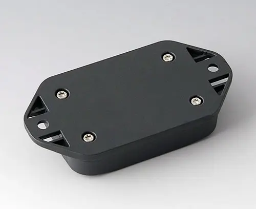 Boitier en plastique en 2 parties avec partie supérieure plate. Partie inférieure avec bride intégrée pour un montage mural rapide ou pour la fixation sur des rails et des profilés tubulaires ou sur un mât. Construction robuste avec assemblage à rainure et languette éprouvé. Vissage avec vis en acier inoxydable et entraînement Torx. Socle de fixation pour les circuits imprimés et les composants dans la partie supérieure et inférieure. La fixation sur les socles s'effectue par sertissage à chaud.