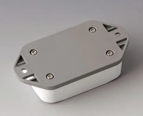 Boitier en plastique en 2 parties avec partie supérieure haute. Partie inférieure avec bride intégrée pour un montage mural rapide ou pour la fixation sur des rails et des profilés tubulaires ou sur un mât. Construction robuste avec assemblage éprouvé à rainure et languette. Vissage avec vis en acier inoxydable et entraînement Torx. Socle de fixation pour les circuits imprimés et les composants dans la partie supérieure et inférieure. La fixation sur les socles se fait par sertissage à chaud.
