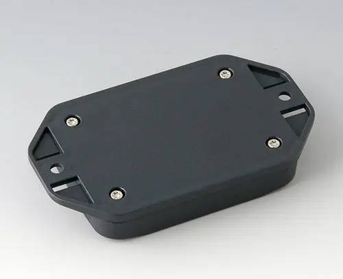 Boitier en plastique en 2 parties avec partie supérieure plate. Partie inférieure avec bride intégrée pour un montage mural rapide ou pour la fixation sur des rails et des profilés tubulaires ou sur un mât. Construction robuste avec assemblage à rainure et languette éprouvé. Vissage avec vis en acier inoxydable et entraînement Torx. Socle de fixation pour les circuits imprimés et les composants dans la partie supérieure et inférieure. La fixation sur les socles s'effectue par sertissage à chaud.