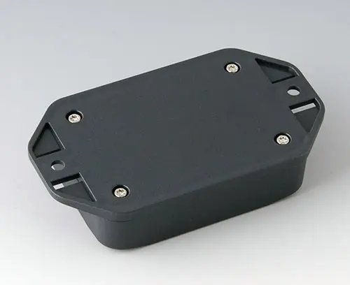 Boitier en plastique en 2 parties avec partie supérieure haute. Partie inférieure avec bride intégrée pour un montage mural rapide ou pour la fixation sur des rails et des profilés tubulaires ou sur un mât. Construction robuste avec assemblage éprouvé à rainure et languette. Vissage avec vis en acier inoxydable et entraînement Torx. Socle de fixation pour les circuits imprimés et les composants dans la partie supérieure et inférieure. La fixation sur les socles se fait par sertissage à chaud.