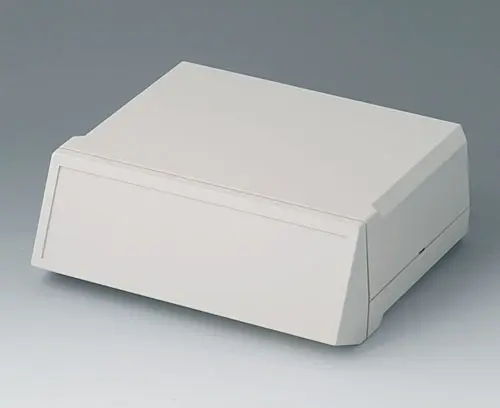MOTEC M, avec poignée étrier Boitier pour périphérique avec poignée étrier dans la version avec partie supérieure haute et inférieure plate. Méchanisme à inclinaison en 30°. Face frontale et face arrière ouvertes. Bossages pour circuits imprimés et guides verticaux pour les plaques de montage. Plaques frontales et arrières disponsibles, à insérer comme accessoire.
