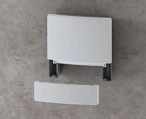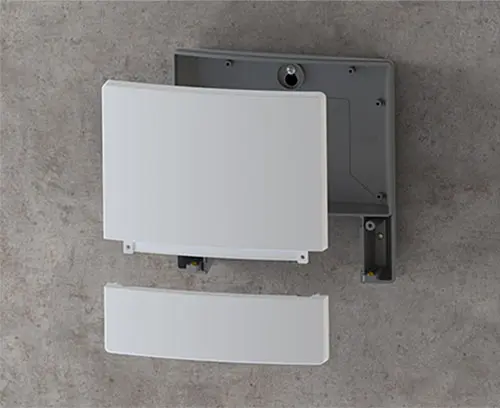Partie inférieure avec ouvertures pour une fixation dissimulée au mur en trois points : 1 trou de serrure pour suspension au centre ainsi que 2 alésages pour sécuriser le boitier en bas à droite et à gauche.