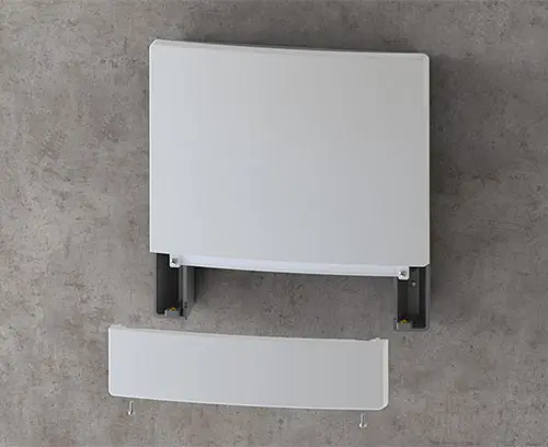 Partie inférieure avec ouvertures pour une fixation dissimulée au mur en trois points : 1 trou de serrure pour suspension au centre ainsi que 2 alésages pour sécuriser le boitier en bas à droite et à gauche.