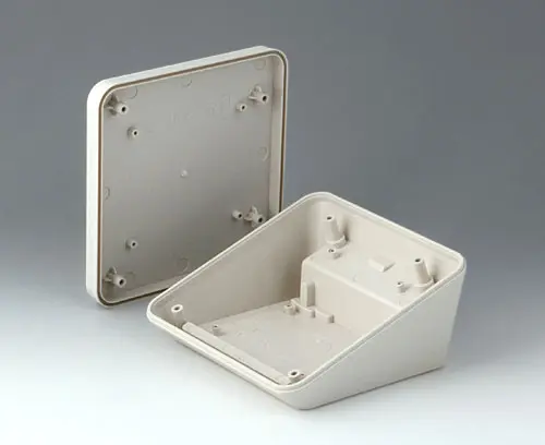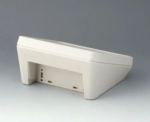 Boitier en matière plastique à deux éléments, au design moderne et avec une inclinaison ergonomique de la surface de visualisation et de commande. Bossages de fixation pour les circuits imprimés et composants dans les parties supérieure et inférieure. Zone interfaces en retrait. Support mural et joint (pour accroître le degré de protection jusqu’à IP 65) dans la gamme des accessoires.